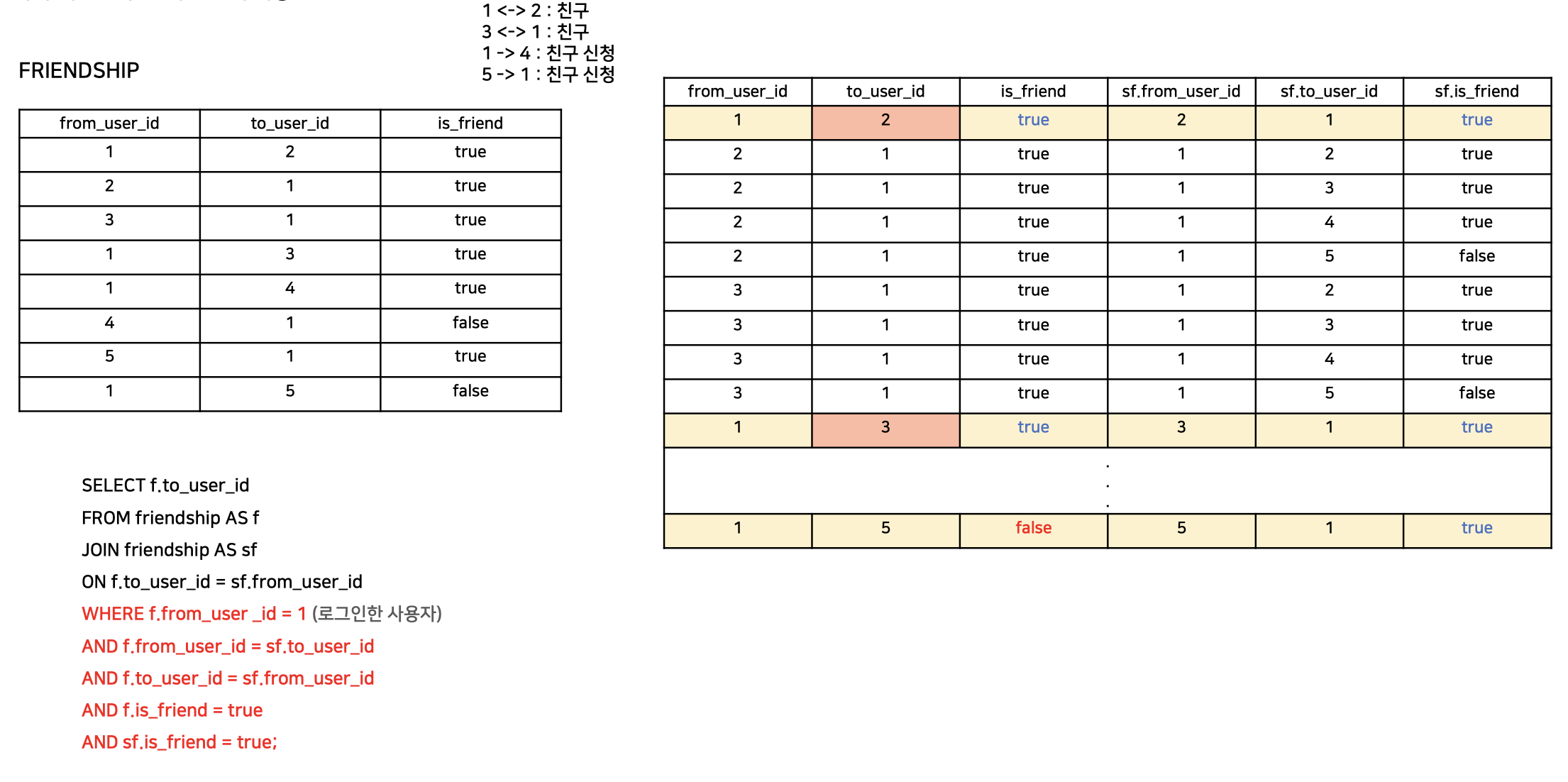 이때 `WHERE f.from_user_id = 1`에서 `1` 부분에는 로그인한 사용자의 id가 동적으로 들어가면 된다.
