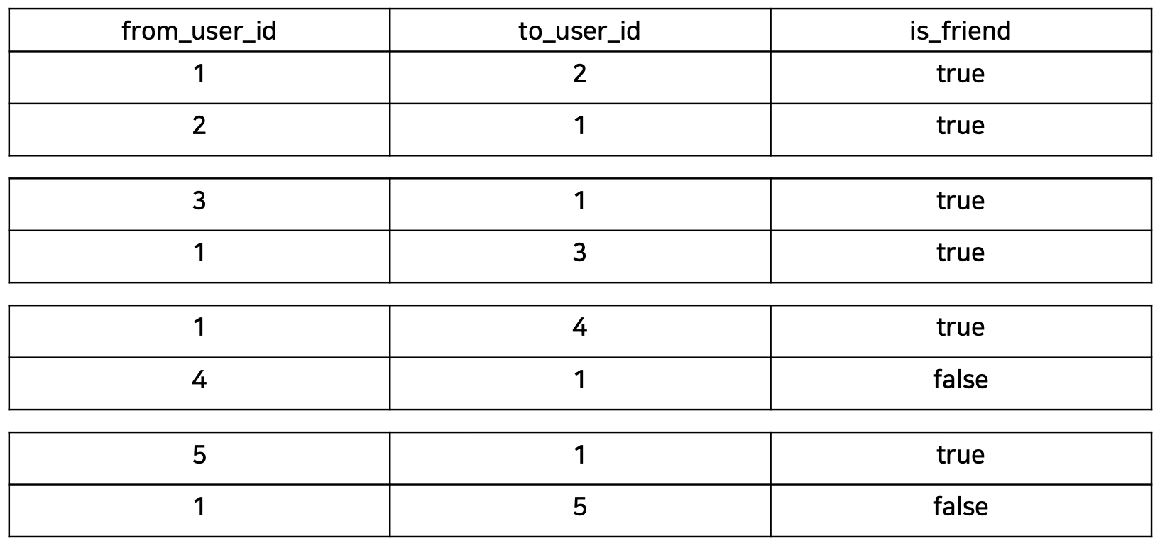 내가 1번 사용자라고 할 때, 아래 표에서 나와 서로 친구인 회원은 2번과 3번이다.