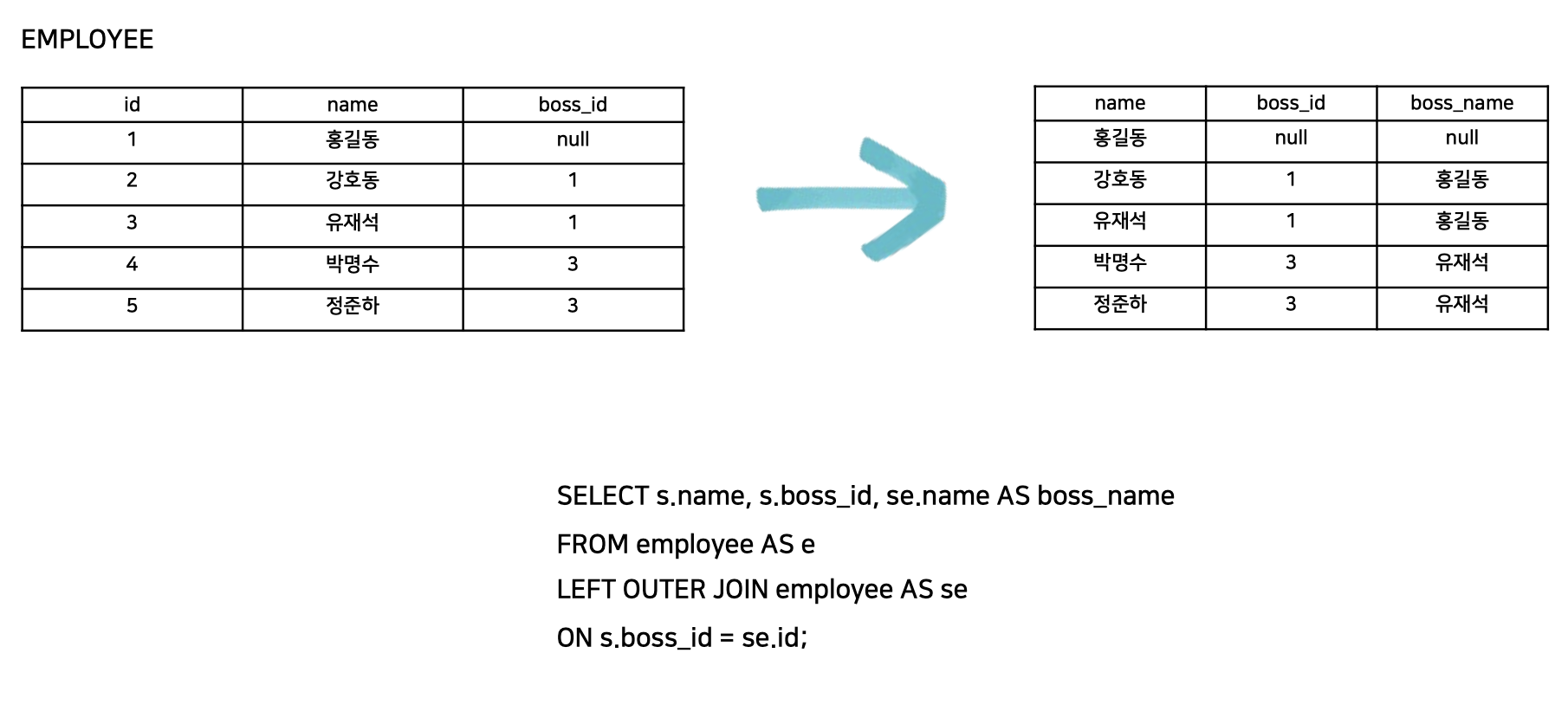 일반적인 JOIN처럼 두 개의 서로 다른 테이블 내에 있는 데이터를 하나의 테이블로 붙이는 대신, 자기 자신 안에 있는 똑같은 데이터를 가져다 붙이는 방식이다.