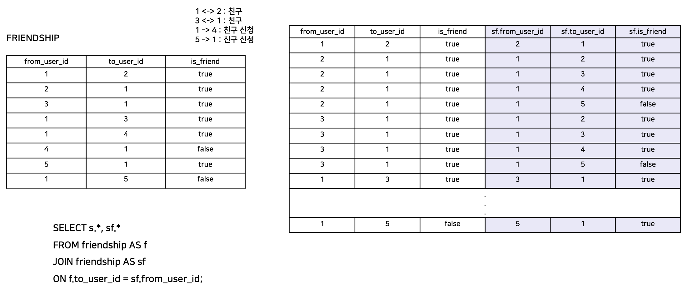 SELF JOIN을 이용하여 서로 친구인 회원을 조회할 수 있다.