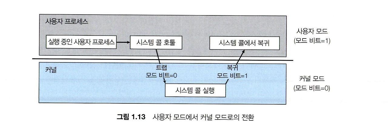 CPU์ ์๋ Mode bit๋ก ๋ชจ๋๋ฅผ ๊ตฌ๋ถํ์ฌ 0์ ์ปค๋๋ชจ๋, 1์ ์ฌ์ฉ์๋ชจ๋๋ก ๋๋์ด์ ๊ตฌ๋.