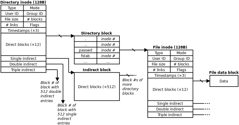 - ๋ฐ์ดํฐ ๋ธ๋ก : ์ค์ ํ์ผ, ๋๋ ํ ๋ฆฌ๋ค์ ์ ์ฅ๊ณต๊ฐ. ๊ทธ๋ฌ๋ ๊ณต๊ฐ ํจ์จ์ฑ์ ์ํด ๋๋ค๋ฅธ ๋ฐ์ดํฐ ๋ธ๋ก๋ค์ ๋ํ ์ธ๋ฑ์ค ๊ณต๊ฐ์ผ๋ก๋ ํ์ฉ๋จ.