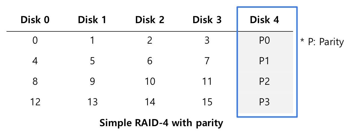 Disk๋ค์ ๋ธ๋ญ๋ค์ ๋ํด xor ์ฐ์ฐ์ ์ํํ์ฌ parity๋ฅผ ์ ์ฅํด๋์๊ธฐ ๋๋ฌธ์ ๋์คํฌ ํ ๊ฐ ์ ๋ ๋ ์๊ฐ๋ parity๋ฅผ ํตํด ์ค๋ฅ ๊ฒ์ถ ๋ฐ ๋ณต๊ตฌ๊ฐ ๊ฐ๋ฅํ๋ค.