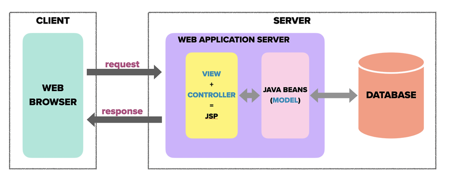 JSP๋ง ์ด์ฉํ ๊ฐ๋ฐ(Model 1)๋ฐฉ์์์๋ Client์ ์์ฒญ์ ๋ํ Logic ์ฒ๋ฆฌ์ response page(view)์ ๋ํ ์ฒ๋ฆฌ๋ฅผ ๋ชจ๋ ํ์ต๋๋ค. ์ด๋ฌํ ๋ฐฉ์์ผ๋ก ์ธํด, ์ ์ฐจ ์ ์ง๋ณด์ ์ธก๋ฉด์ ํ๊ณ๋ฅผ ๋๋ผ๊ฒ ๋์์ต๋๋ค.