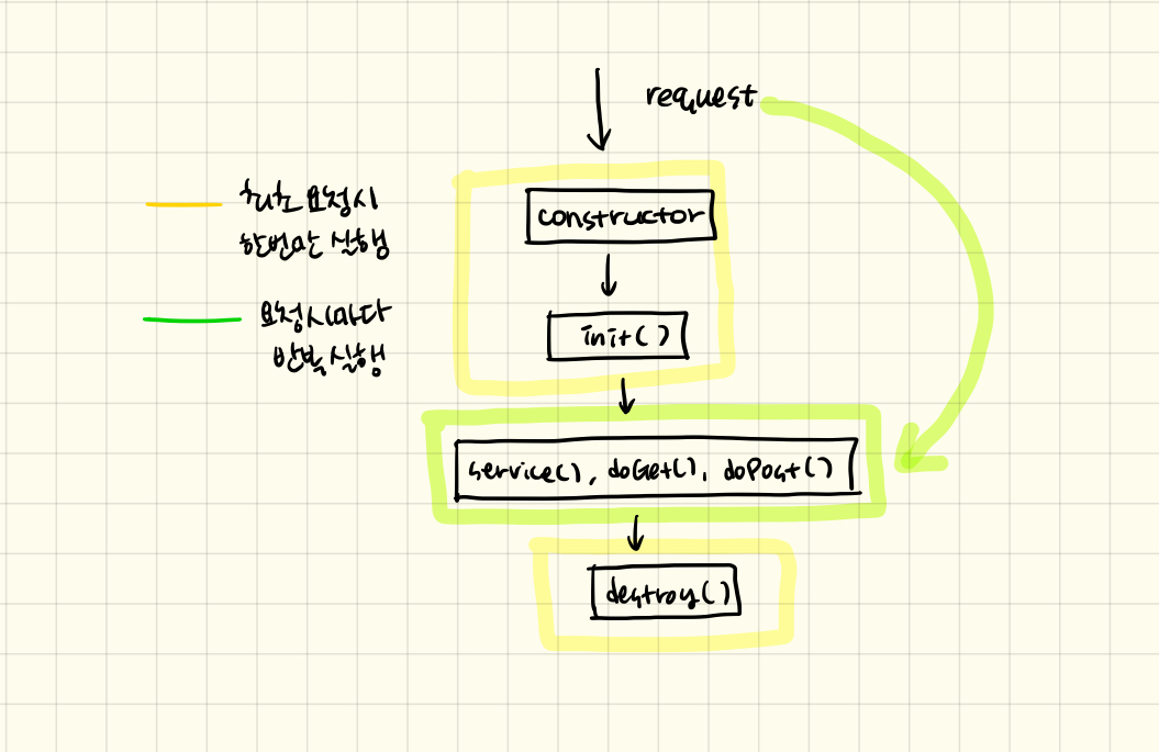 1. ๋จผ์ WAS๋ ํด๋ผ์ด์ธํธ๋ก๋ถํฐ ์๋ธ๋ฆฟ ์์ฒญ์ ๋ฐ์ผ๋ฉด ํด๋น ์๋ธ๋ฆฟ์ด ๋ฉ๋ชจ๋ฆฌ์ ์๋์ง ํ์ธํฉ๋๋ค.
