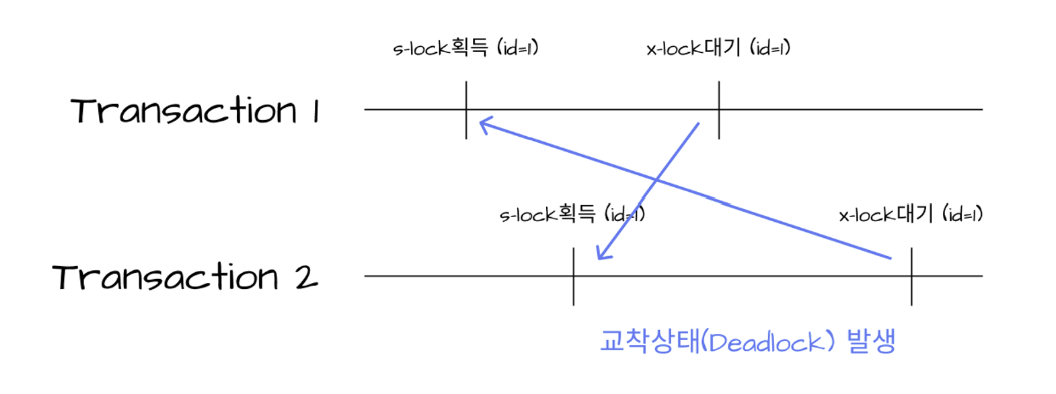 - Transaction 1이 id=1인 공유 데이터에 x-lock을 얻고 싶지만, Transaction 2에서 해당 데이터에 s-lock을 걸어두었기 때문에 대기한다.