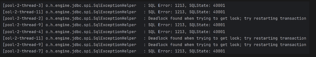 출력문을 보면 Deadlock found when trying to get lock; try restarting transaction 이라는 문구를 확인할 수 있다.