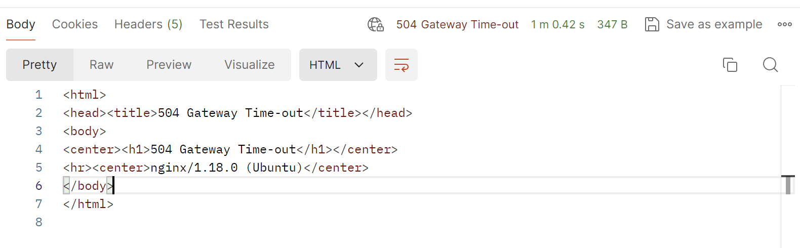 nginx timeout이 기본 1분인데, 이를 2000s로 늘려서 해결했다.