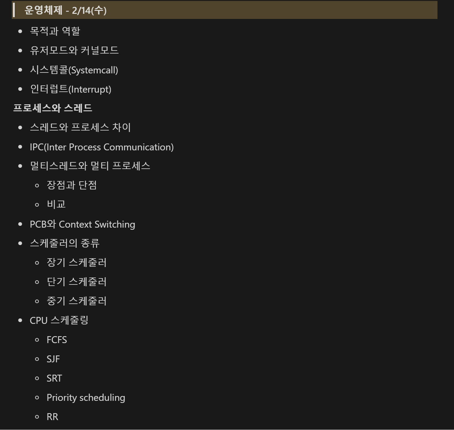 운영체제 목적 - 처리 빠르게 - 반환 시간 단축 운영체제의 역할 - 하드웨어 제어 - 스케줄링 - 메모리 관리 유저모드와 커널모드 CPU는 사용자 애플리케이션이 시스템을 손상시키는 것을 방지하기 위해 2가지 모드를 제공. CPU에 있는 Mode bit로 모드를 구분하여 0은 커널모드, 1은 사용자모드로 나뉘어서 구동. 유저모드 - 사용자 응용 프로그램이 실행되는 모드 - 사용자가 직접적으로 접근할 수 있는 제한된 자원만 접근 가능. 시스템 자원이나 하드웨어에 직접적인 접근 불가 커널모드 - 커널이 실행되는 모드 - 시스템 자원 및 하드웨어에 대한 접근을 허용 시스템 콜 (System Call, 시스템 호출) 사용자 모드에 있는 응용 프로그램(user process)이 시스템 자원을 사용해야할 때 시스템..